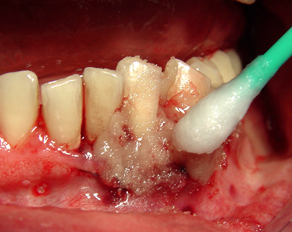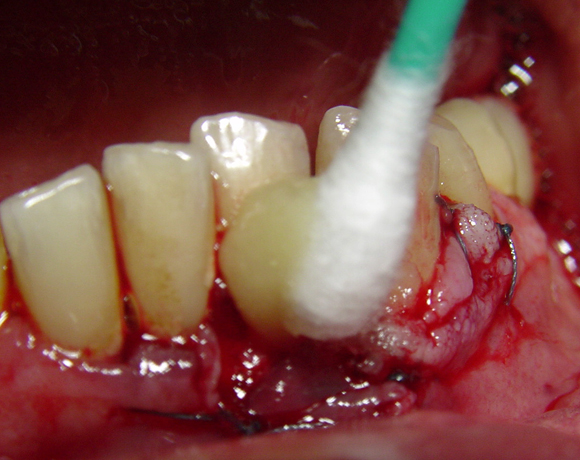 Mit einem nassen Wattestäbchen wird die Oberfläche der Salbe zum gelieren gebracht, so dass die klebende Wirkung aufgehoben wird, die Salbe an der aufgetragenen Stelle verbleibt und sich nicht im ganzen Mund verteilt.