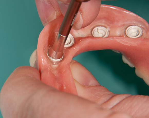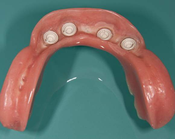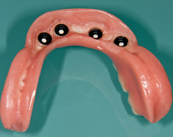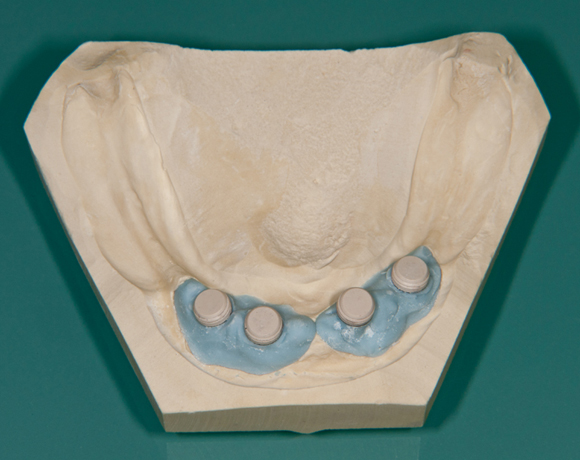 Bild 04: Unterfütterung der Unterkieferprothese, mit Einzeichnung der Implantatlage