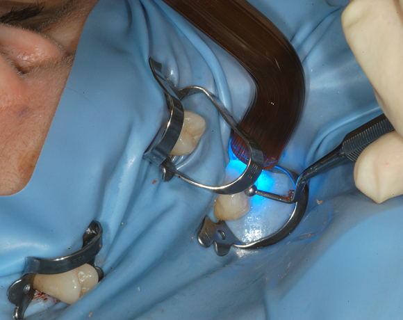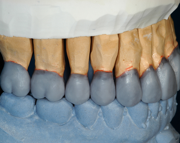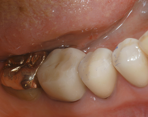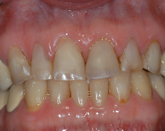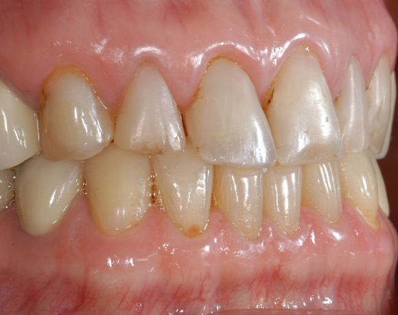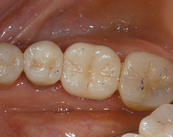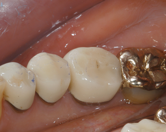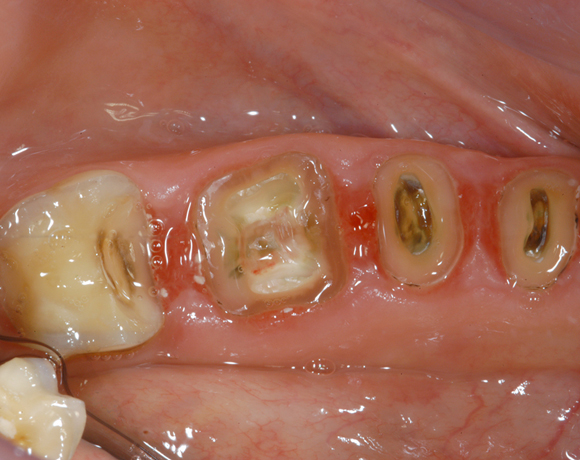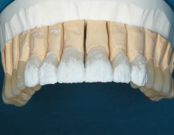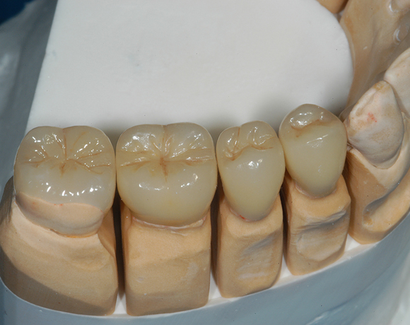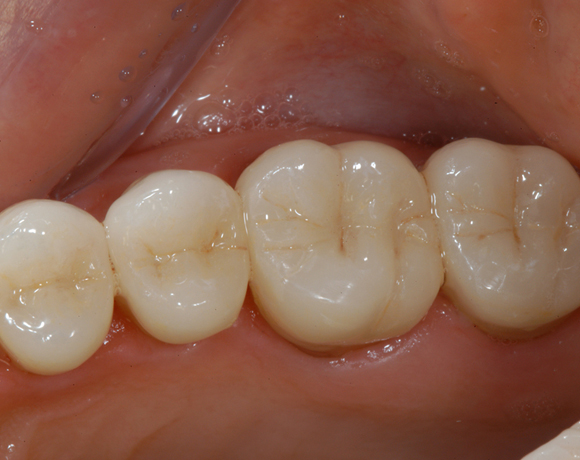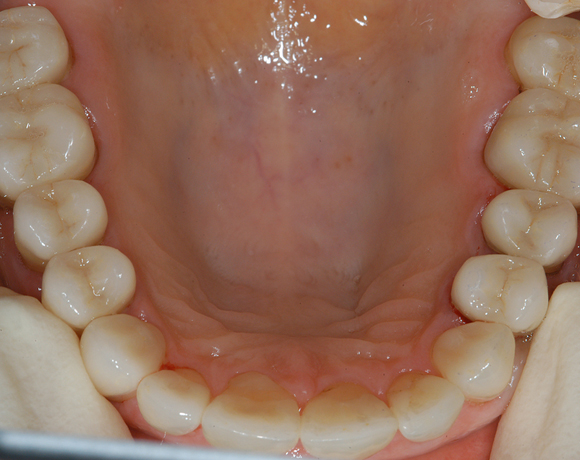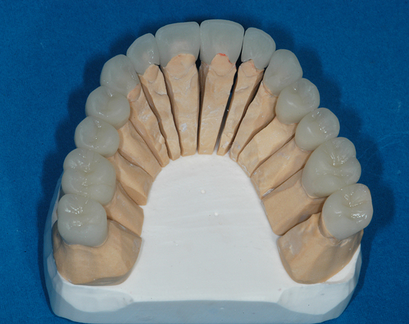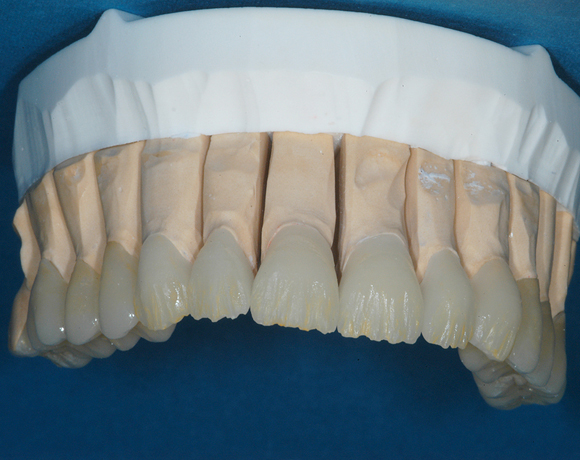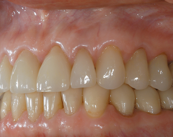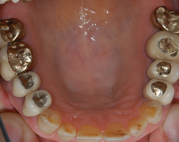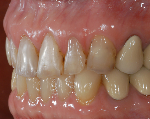 Hier wurden der ganze Oberkiefer und die Seitenzähne im Unterkiefer mit neuen Kronen aus Empress 2 und mit Eris Verblendkeramik versorgt.