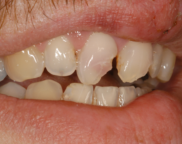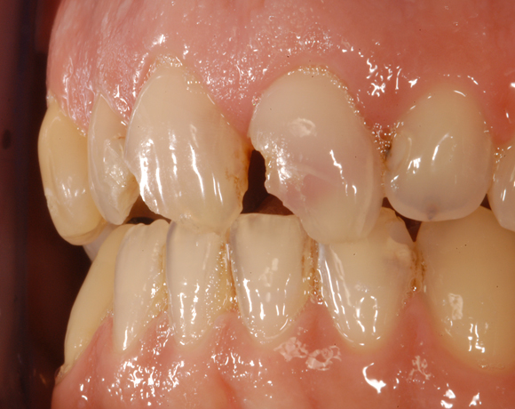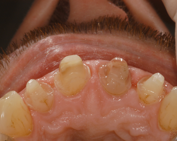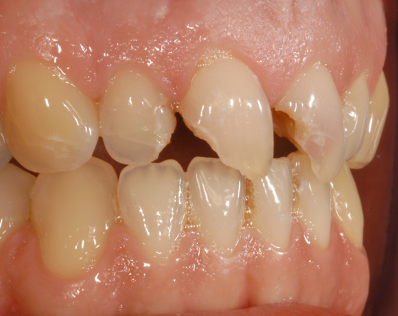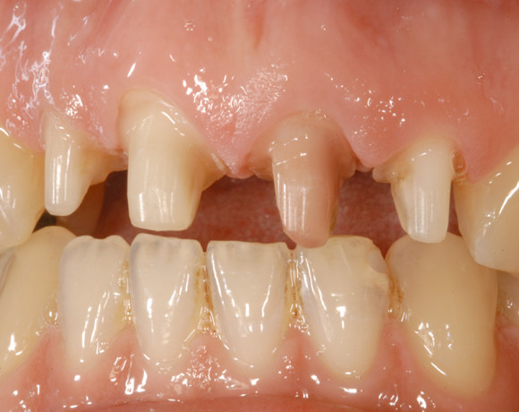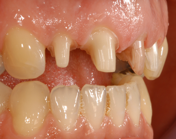 Bei dem vorliegenden Patientenfall wurden durch einen Sturz vom Fahrrad die Oberkieferfrontzähne sehr in Mitleidenschaft gezogen, eine Neuversorgung der mittleren Schneidezähne wurde notwendig.