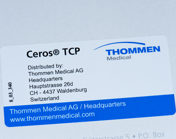Ceros TCP Putty ist ein knetbares und synthetisches Knochenersatzmaterial auf der Basis von reinem Beta-Trikalziumphosphat-(β-TCP) Granulat in einem Hydrogel aus fermentierter Hyaluronsäure. Durch das Hydrogel erhält Ceros TCP Putty seine knetbare Eigenschaft, was die Applikation des Materials auch in schwer zugänglichen Defekten wesentlich vereinfacht.