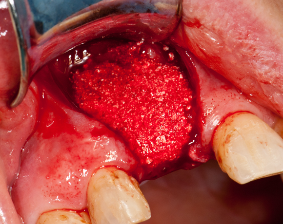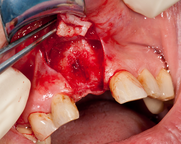 Im vorliegenden Patientenfall sollte ein Implantat für den extrahierten Zahn 11 gesetzt werden. Leider war der vestibuläre Anteil der Alveole des Zahnes 11 bei der Extraktion verloren gegangen. Damit ein ausreichendes Knochenlager zum Implantieren vorhanden ist, musste ein Knochenaufbau gemacht werden.