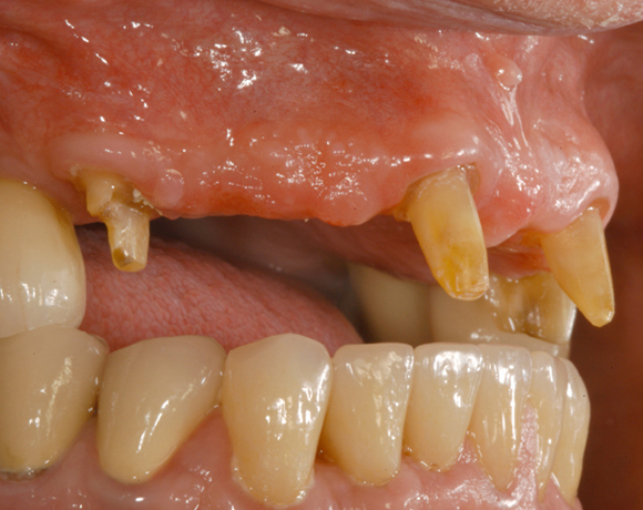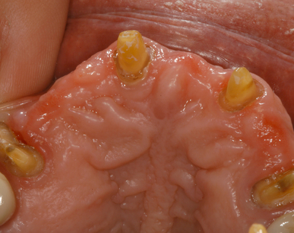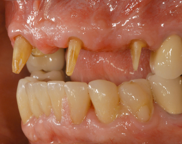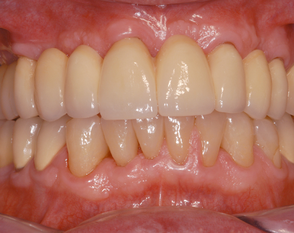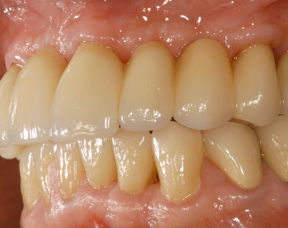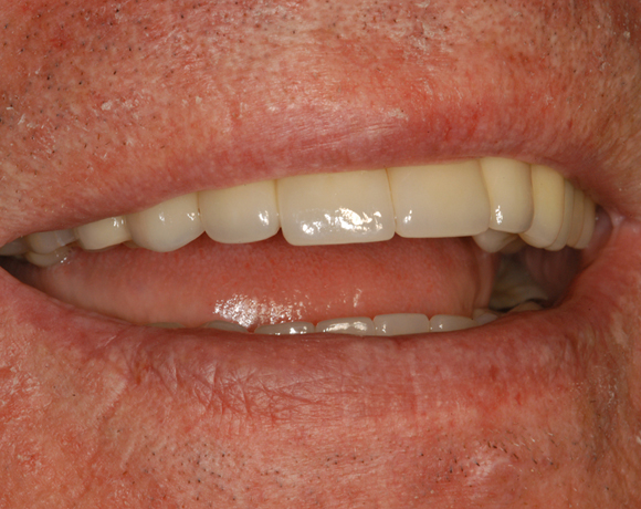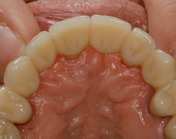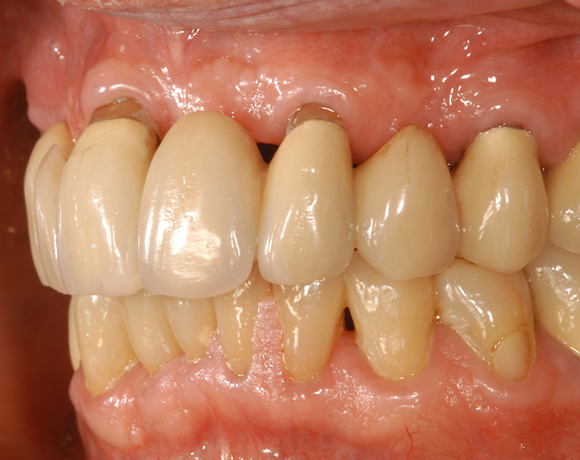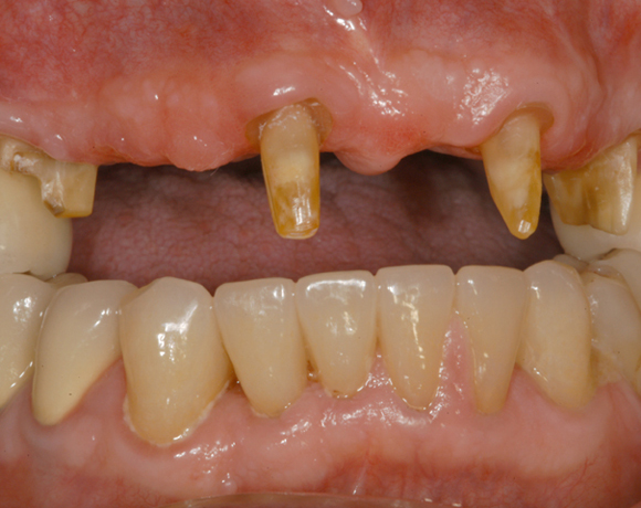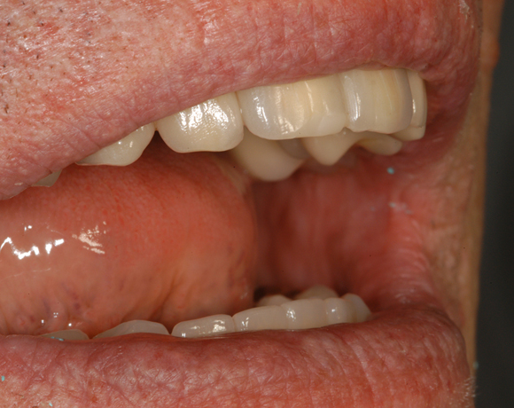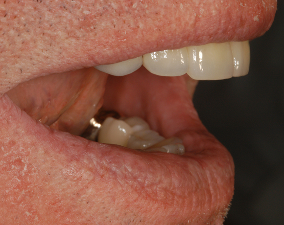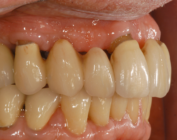 Bei diesem Patienten soll die metallkeramische Brücke von Zahn 14 – 24 erneuert werden. Für diese große Brücke sind nur vier intakte Pfeilerzähne vorhanden. Die Unterkieferfront ist bereits mit Empress Veneers versorgt.
