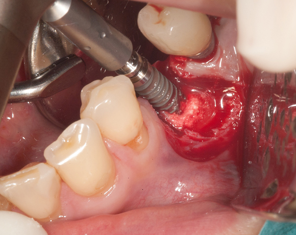 um Implantate aufzunehmen. Hier bietet es sich an den Knochen zu spalten, bei gleichzeitiger Insertion der Implantate und die freien Zwischenräume mit Kunstknochen aufzufüllen. Die Augmentation wird mit einer Membran abgedeckt. Die Einheilzeit beträgt sechs Monate.