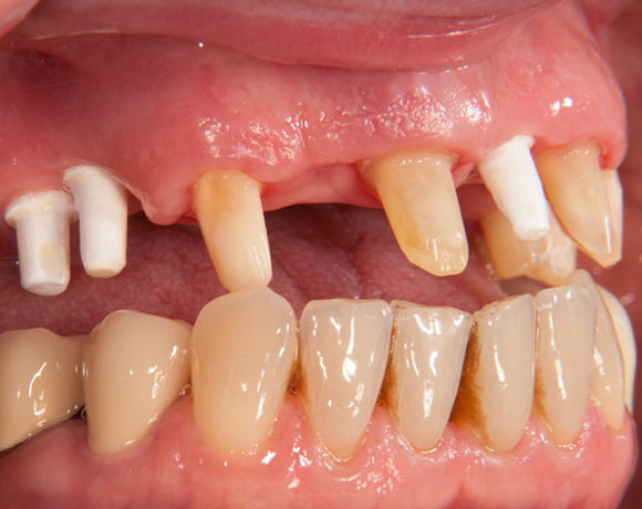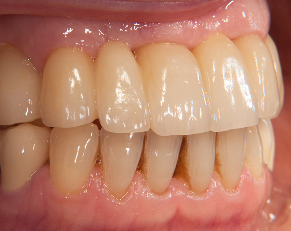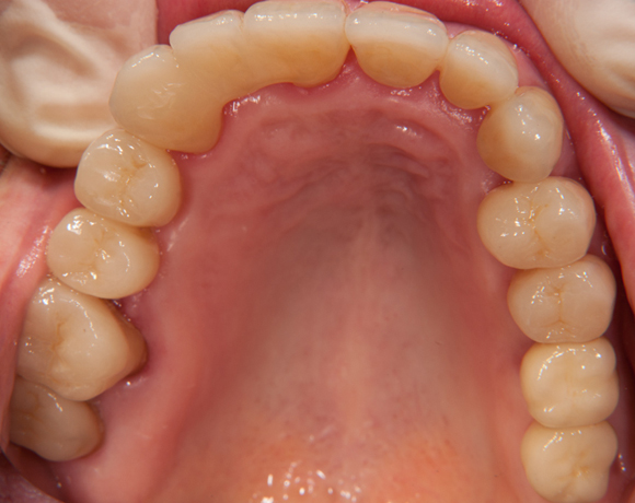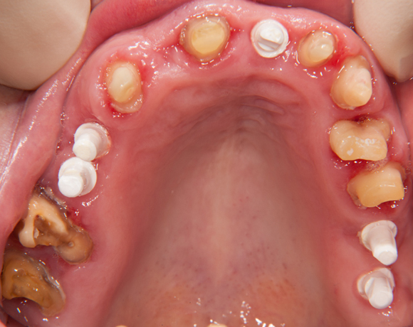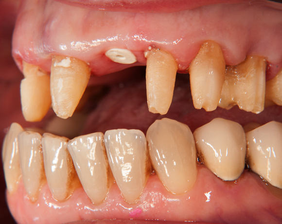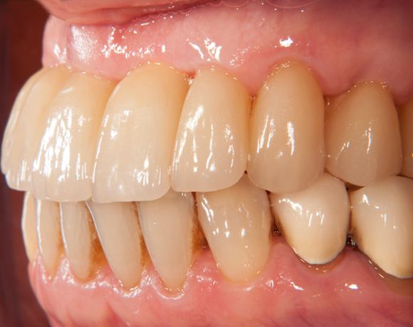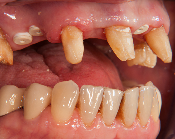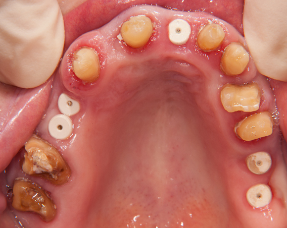 Im vorliegenden Patientenfall wurde eine Teleskopprothese mit acht Teleskopen, ersetzt durch eine Einzelzahnversorgung auf acht eigenen Zähnen und fünf Implantaten und einer kleinen Brücke.