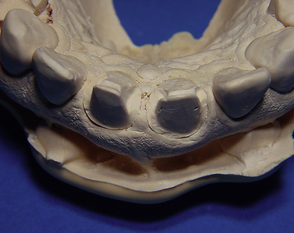 Cervikal sollte eine Stufe mit runder Innenkannte vorhanden sein, um die inzisalen Kräfte aufzufangen. Auch die Inzisalkannte muss gefasst werden.
