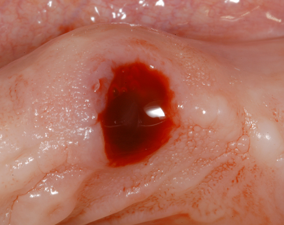 Bild 01: Blutende Extraktionsalveole nach Spülung mit ozoniertem H2O2